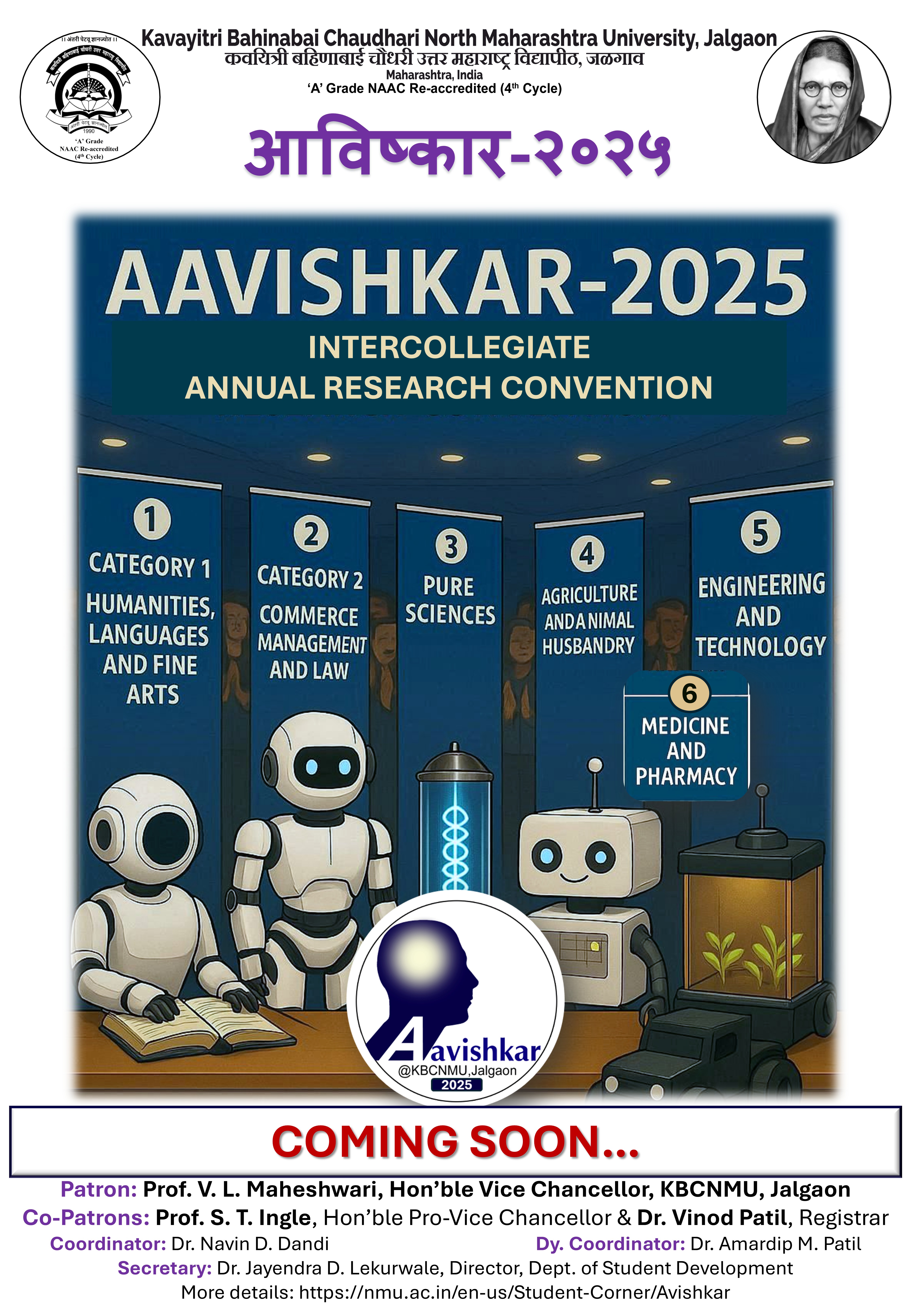 His Excellency, the Governor of Maharashtra, Shri. S. M. Krishna has initiated a novel inter university research project competition named ‘AAVISHKAR’ in the year 2006. Aavishkar is a research festival provides platform for all students to present and globalize their innovations, ideas, and skills. University has taken special efforts to encourage the students from rural and urban areas of Khandesh for active participation in Aavishkar.
